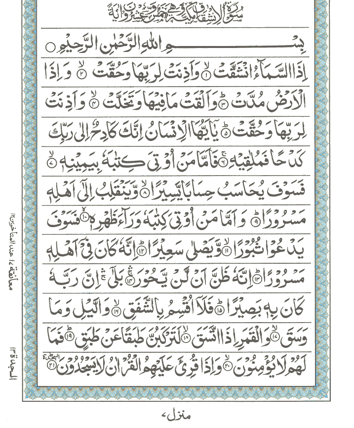 JUZ No. 30 Surah No. 84 " Al-Inshiqaq " Ayat No. 001 to 025